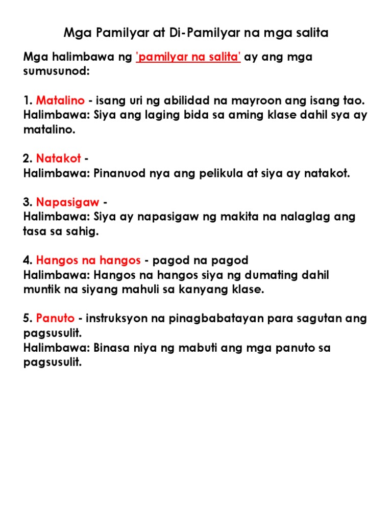 10 hindi pamilyar na salita sa filipino Meron ba kayong mga salita na Hirap o kadalasan hindi ninyo mabasa kahit ito ay nakatitik at nakalimbang na wikang Pilipino. Tiningnan ng manghuhula ang badhi sa kamay ni. Some of the worksheets for this concept are Filipino To 12 gabay pangkurikulum Halimbawa ng talata gamit ang pang uri Uri ng mga salita ayon sa kayarian Konotasyon at denotasyon Filipino baitang 7 ikaapat na markahan Filipino Supplemental filipino high school grade 7 4rth q.