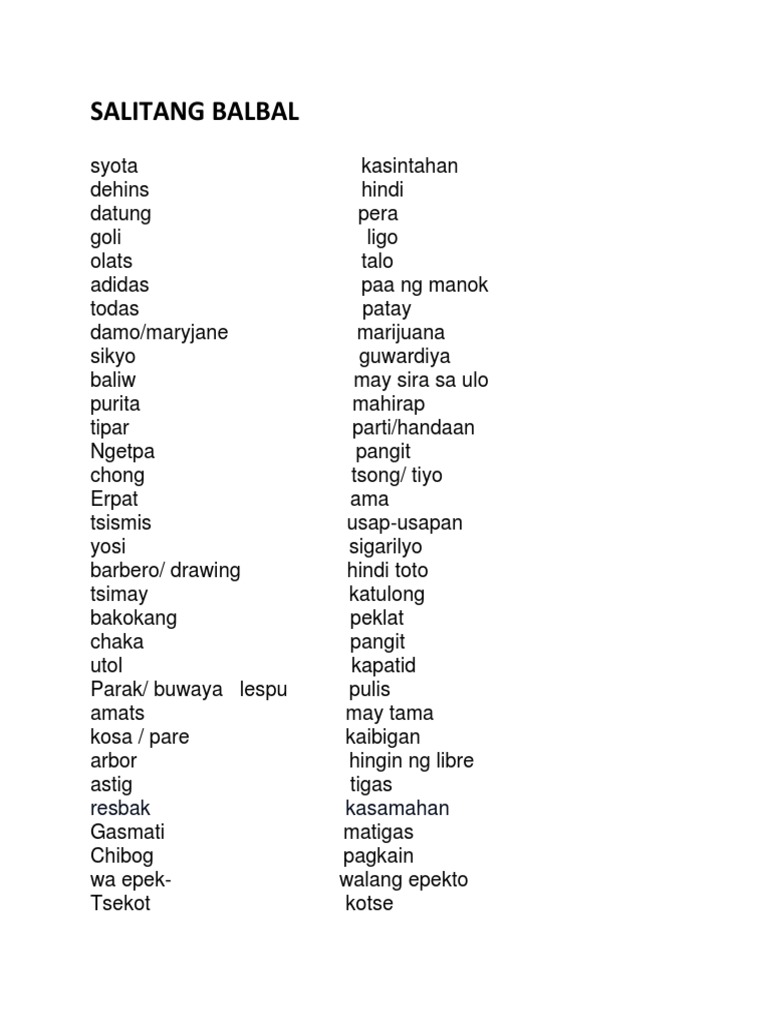 Maari ring magbaliktad ng papantig tulad ng salitang hindi na nagiging dehin. Buwaya crocodiles greedy bata child girlfriend durog powdered high in addiction papa father lover 4. Halimbawa ng mga balbal na salita.