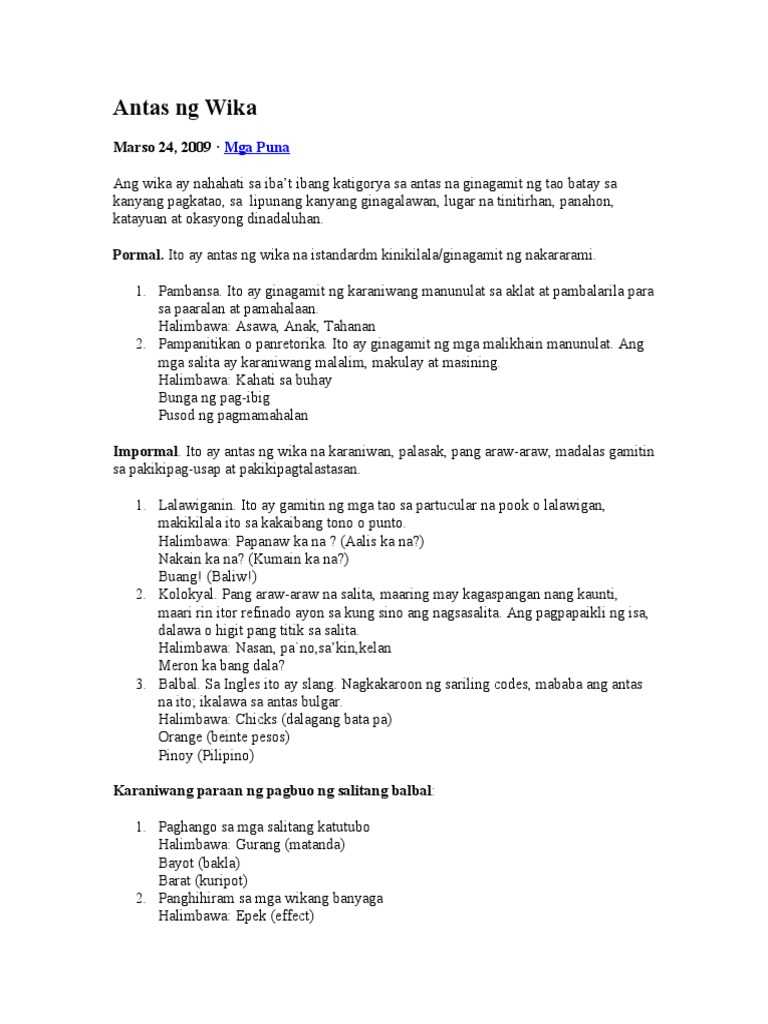 Antas Ng Wika Antas Ng Wika 1 Formal At Di Formal U2013 Di Formal Na Wika Ang Wikang Ginagamit Ng Tao Sa Ka Edad Samantalang Formal Naman Ang Course Hero